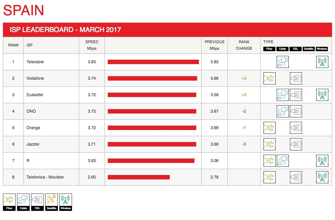 El aumento más significativo con respecto al mes anterior lo consiguió “R” que incrementó su velocidad en 0,57 megabits por segundo (Mbps), llegando a alcanzar los 3,63 Mbps y mejorando así los 3,06 Mbps alcanzados en febrero. Las subidas de velocidad también ayudaron a Vodafone a mejorar en tres puestos hasta colocarse en segunda posición mientras que Euskaltel escaló otros tres puestos, quedando tercero.
